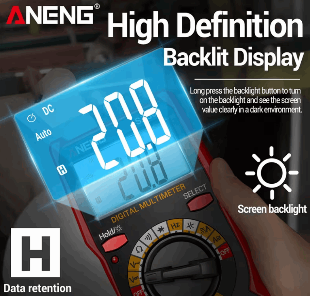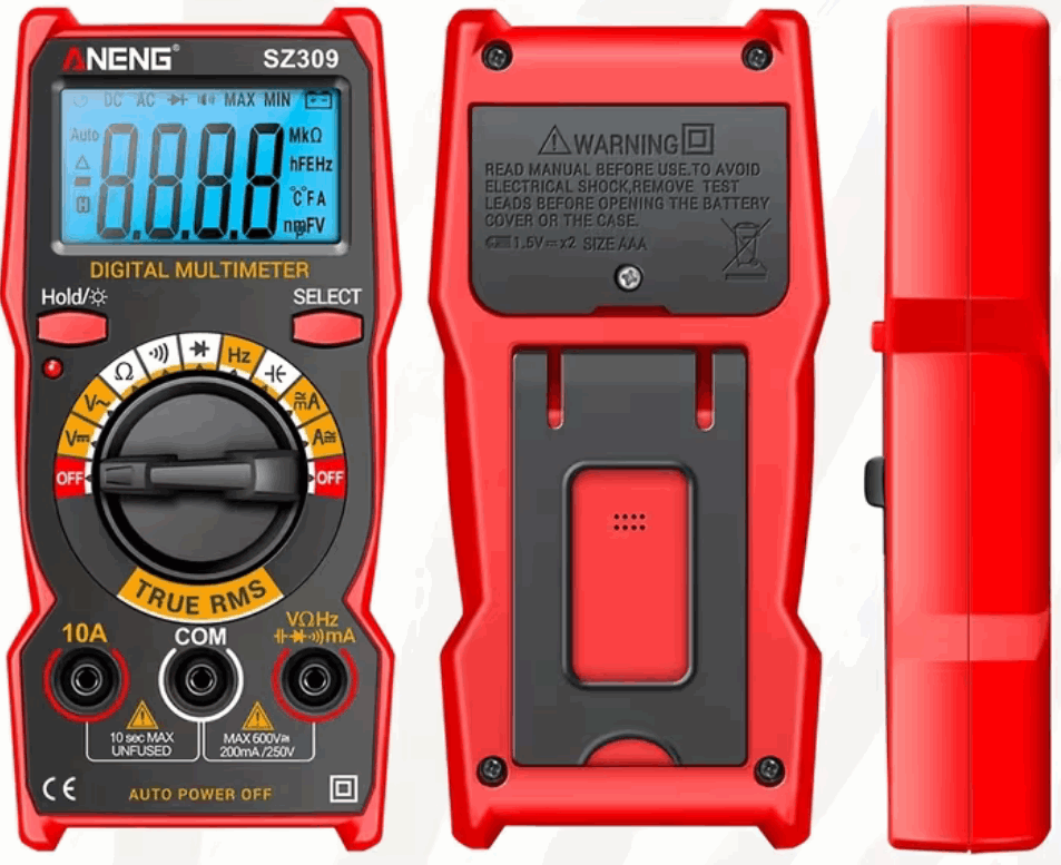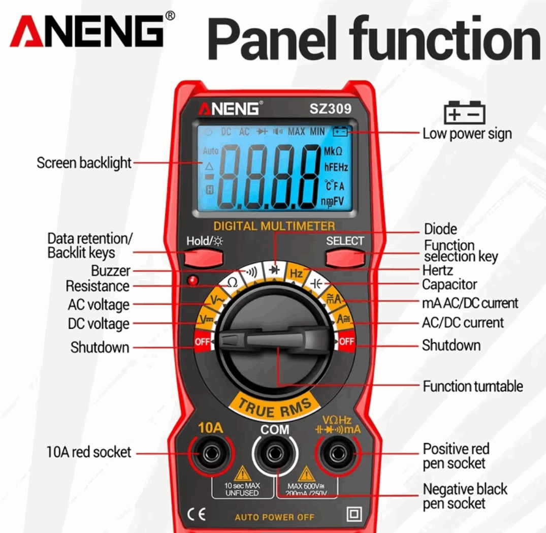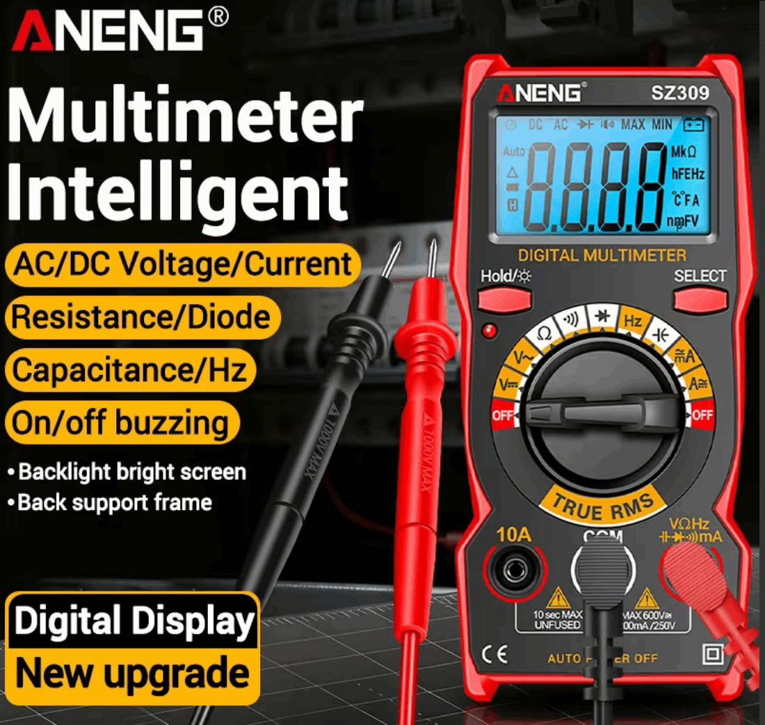 ANENG SZ309 Multimeter er en digital tester for AC og DC strøm og spenning, med bakgrunnsbelyst skjerm og portabilitet, noe som gjør den til et praktisk elektrisk instrument.