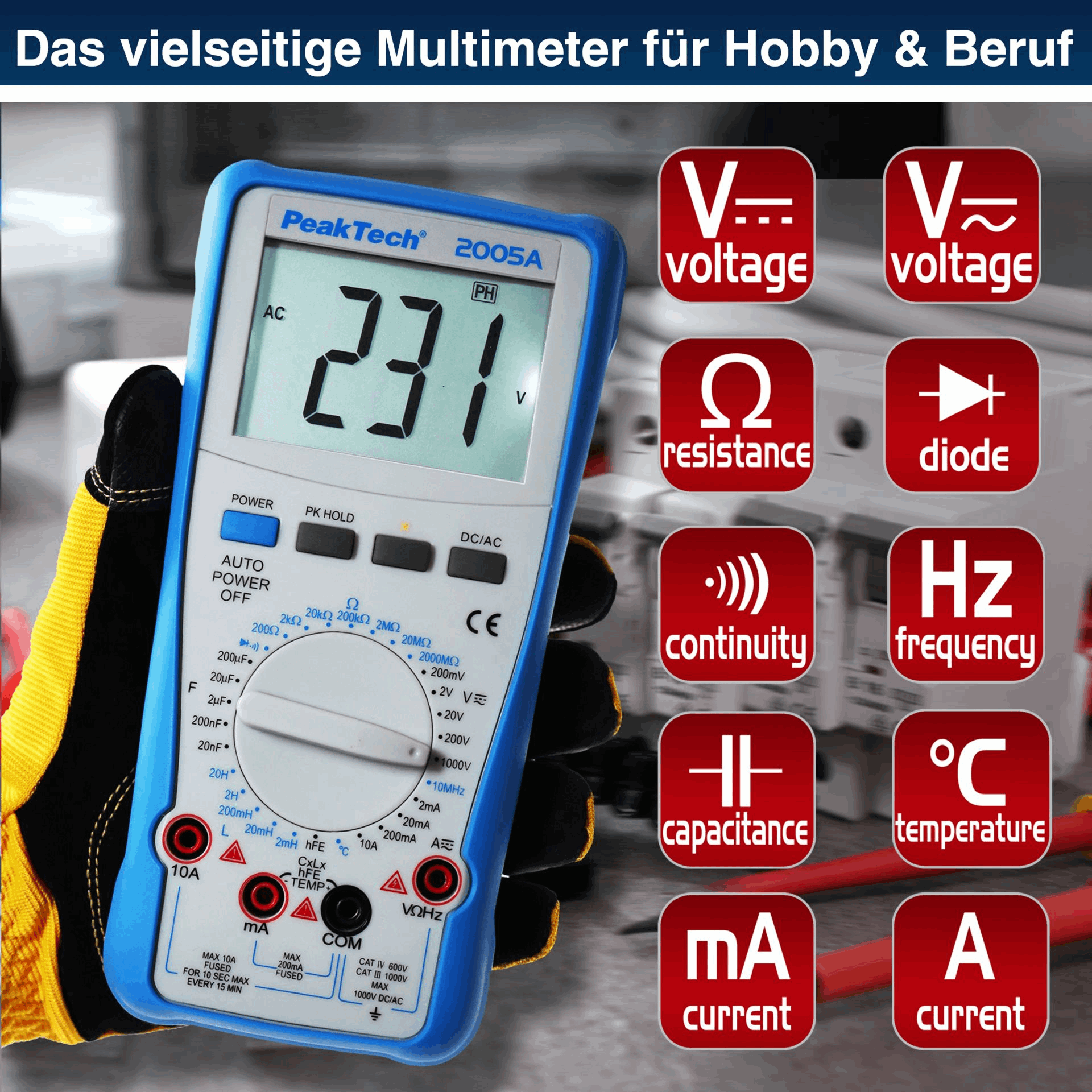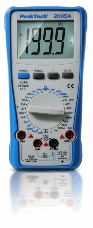 The new PeakTech 2005 A offers a multitude of measurement functions for electrical measured variables for every user from industry, craftsmanship, training, hobby and the laboratory. It was manufactured according to the latest development aspects and has a double-insulated injection-molded housing with rubber coating, a tilt stand on the back, which can be removed to replace the batteries. The fuses are located underneath the stand as well, if it is neccessary to replace these. The device is working with a battery and has an LCD screen with a character height of 32 mm. The manual range selection enables a very fast response time and the measured values ??can be easily read on the illuminated display. The PeakTech 2005 A can be used to measure DCV, ACV, DCA, ACA, resistance, capacitance, diode, transistor, continuity, temperature, frequency and inductance, which create a wide range of applications. Due to the high overvoltage category CAT III 1000V, you can use this device safely on electrical installations and systems.