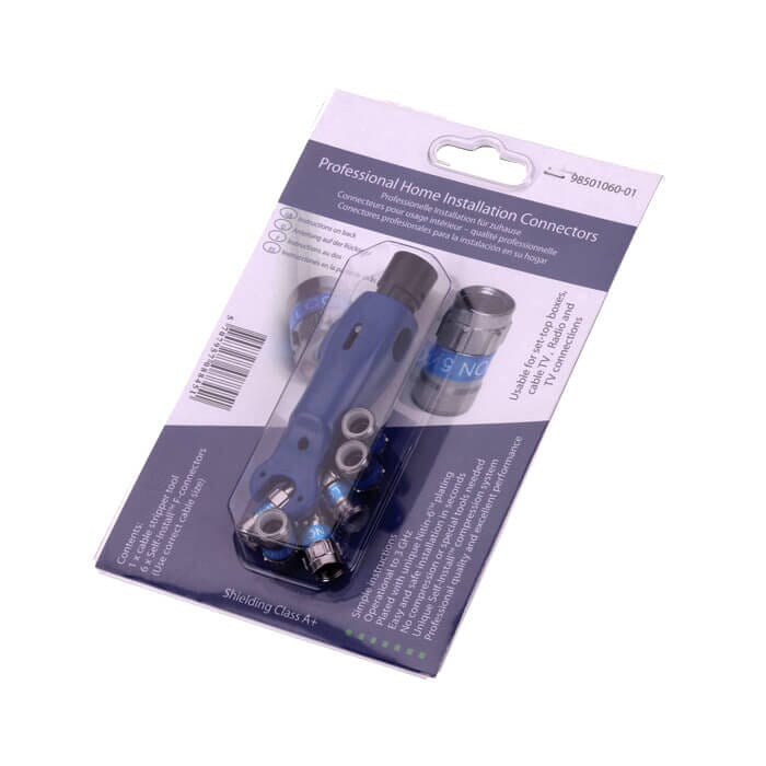Sett som består av et kabelavisoleringsverktøy og seks "Self Install" F-kontakter. For enkel enkel og presis installasjon. Kontakten presses på kabelen uten behov for bruk av verktøy. Den kobles automatisk til kabelen. Kabeltype KOKA 500, KOKA 80, KOKA 6 Impedans 75 Ohm Skjermingseffektivitet: @ 30-862 MHz > 110 dB @ 862-3000 MHz > 100 dB