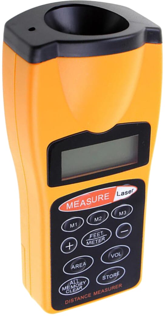 Distansemåler som måler med ultralyd, måler avstand og beregner volum og areal, laserpeker, oransj/svart