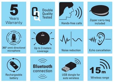 Sandberg Bluetooth Speakerphone Pro er en enkel og fleksibel audio-løsning til online-møter. Koble den til USB-porten på datamaskinen, med kabel eller trådløst via Bluetooth, så har du straks høyttaler og mikrofon i én og samme enhet. Kan via Bluetooth også anvendes med alle mobile enheter til både videochat og vanlig telefonsamtale. Perfekt som alternativ til headsett på hjemmekontoret, eller til møtelokalet på kontoret. Med 360-graders støydempende mikrofon til å fange opp stemmer fra enhver vinkel i lokalet, som gjengis krystallklart og uten ekko.