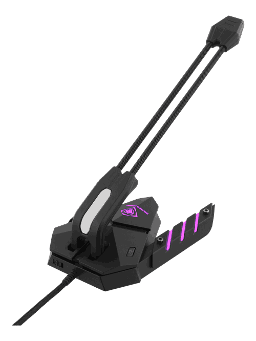 Desktop microphone with RGB lighting! This simple but oh so stylish wooden microphone is placed within 15-30cm away from you. The microphone is connected to your computer via the built-in USB-A cable. The mirophone sits on an arm that can move up and down. On the base of the microphone is a mute button and an On / Off switch.
