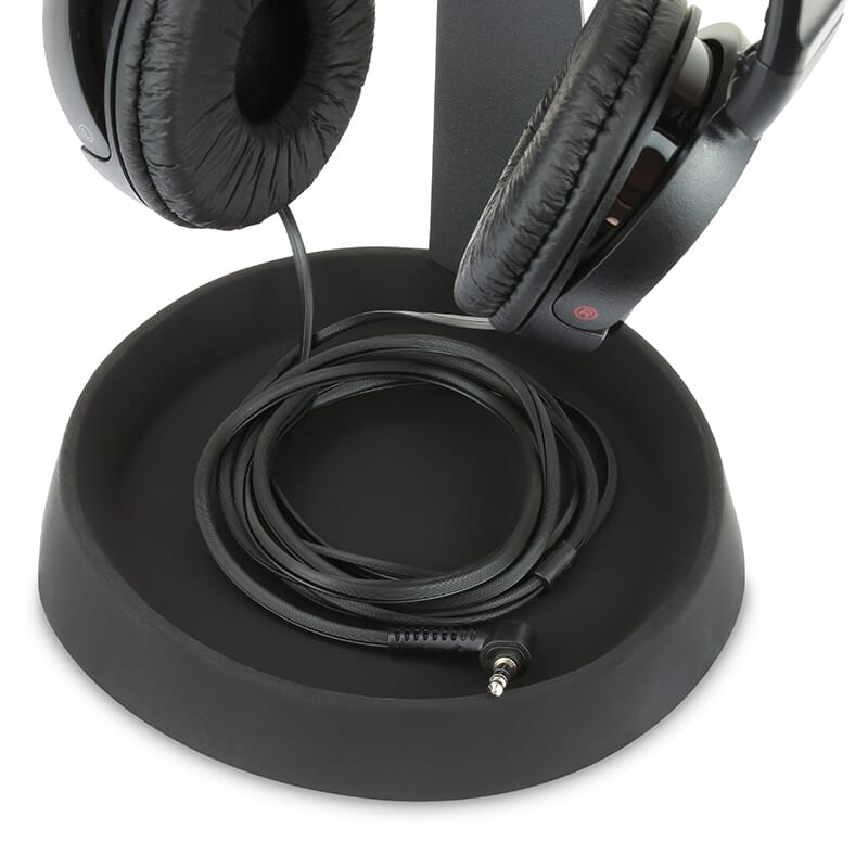 Dynavox KH-1000 hodetelefonstativ kombinerer stilig design og funksjonalitet på en mesterlig måte. Det er kompatibelt med så godt som alle hodetelefoner og merker (med en hodebøylebredde på opptil 38 mm). Myke silikonputer for hodetelefoner og kabler beskytter dem mot riper og andre skader. Samtidig står KH-1000 sikkert og stabilt takket være det robuste metallhuset, og den praktiske silikonkabelskuffen forhindrer at den sklir. Med sitt tidløse design passer KH-1000 sømløst inn i ethvert miljø, og kabelskuffen gir også ekstra plass til en mobiltelefon eller fjernkontroll.