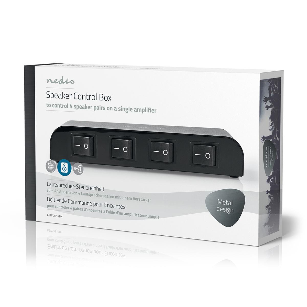 • Veksle mellom fire par høyttalere - eller spill dem samtidig