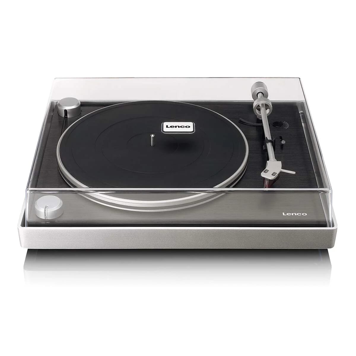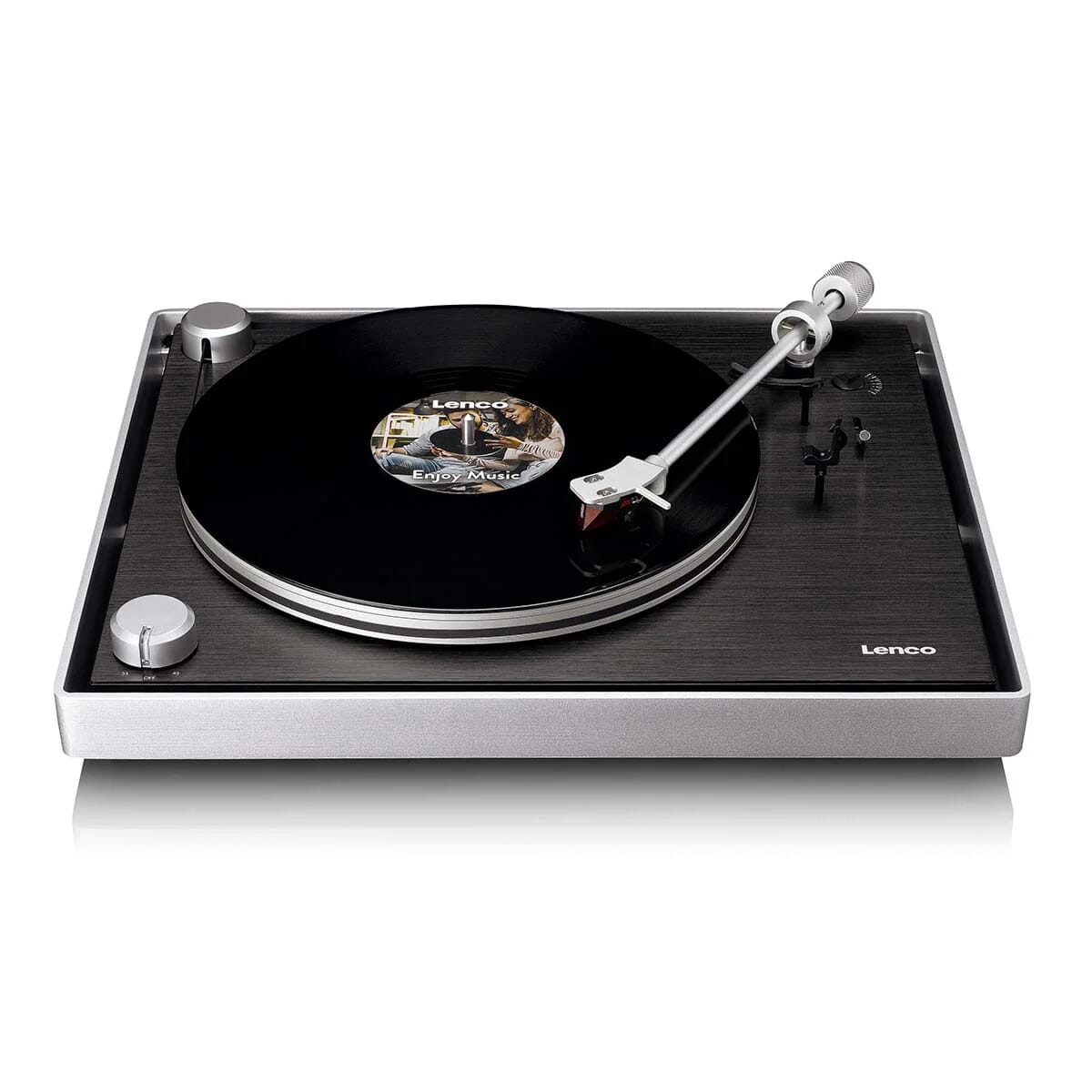 A glance at the Lenco L-455BK immediately reveals the harmonious combination of the sleek black finish and brushed aluminium frame. This high-quality finish lends the record player a luxurious appearance, with the tonearm demanding equal attention. The minimalist tonearm boasts a clean and straightforward design. The refined metal turntable platter further enhances the elegance, perfectly complementing the overall aesthetic. And we haven’t even mentioned the cartridge yet!