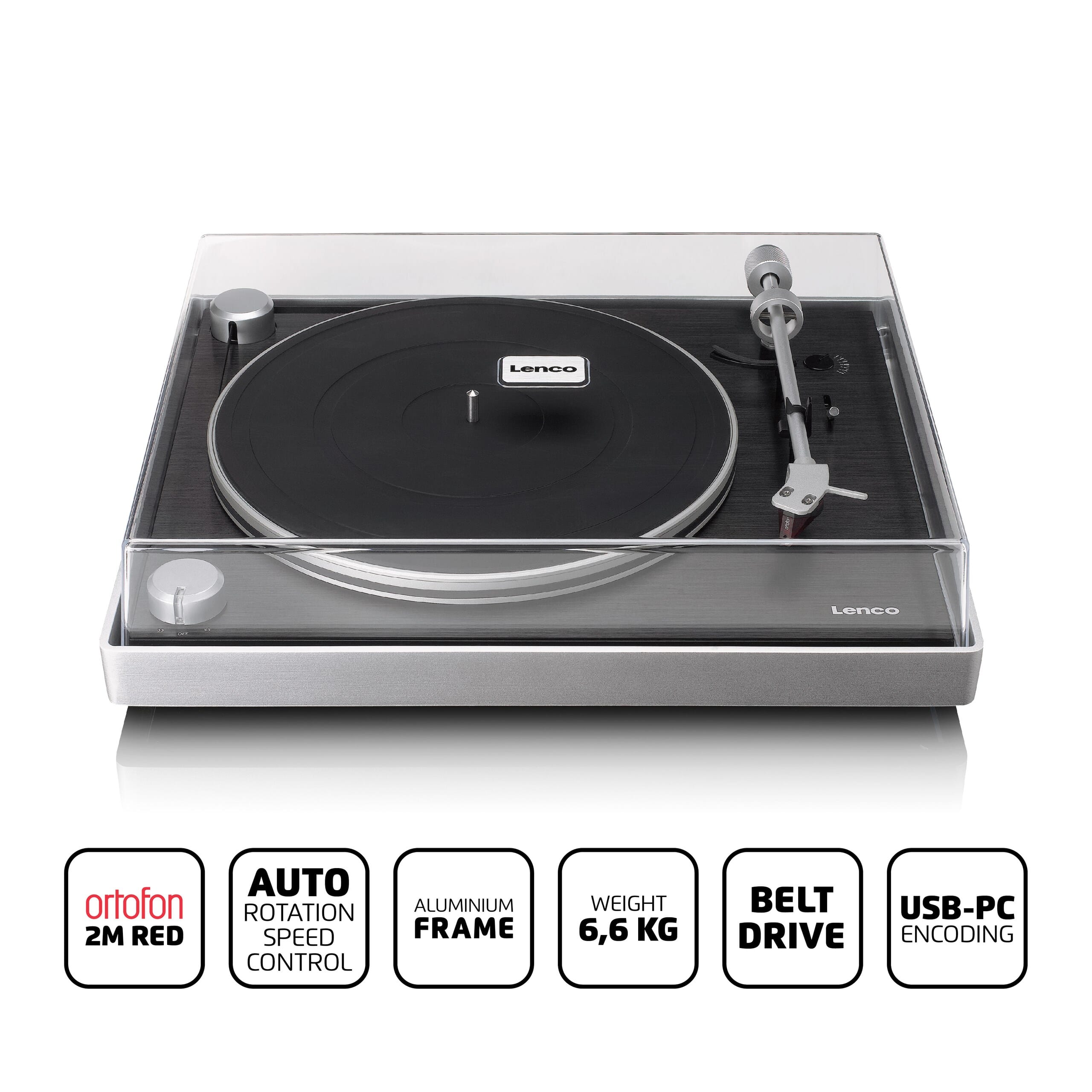 Meet the Lenco L-455BK, a high-end record player from Lenco's Expertise line, featuring a visible belt drive, a brushed aluminium frame, and the Ortofon 2M RED cartridge. The unique design, with its externally visible belt drive, exudes modernity and sophistication. The L-455BK is also equipped with a 300 mm metal turntable platter that, combined with the belt drive, ensures smooth and stable rotation. Thanks to the premium Ortofon 2M RED cartridge and automatic control and correction of rotation speed, your records are always played with ultimate precision. With the start-stop operation and mechanical tonearm lift, you’ll enjoy an intuitive and professional user experience. Are you a true audiophile? Read on and be inspired by the Lenco L-455BK, a record player that perfectly balances technology, design, and exceptional sound quality.