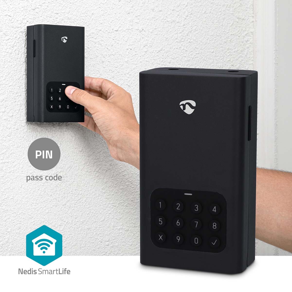 Låseboksen vår tilbyr flere måter å låse den opp på, slik at alle enkelt kan få tilgang til den. Du kan låse opp boksen eksternt via Nedis Smartlife-appen eller ved å angi et lokalt permanent passord. I tillegg kan du generere et midlertidig passord som kan deles med besøkende eller gjester.