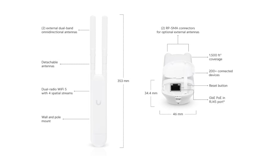 Kompakt ute/innendørs WiFi5 aksesspunkt med PoE og utskiftbare antenner.