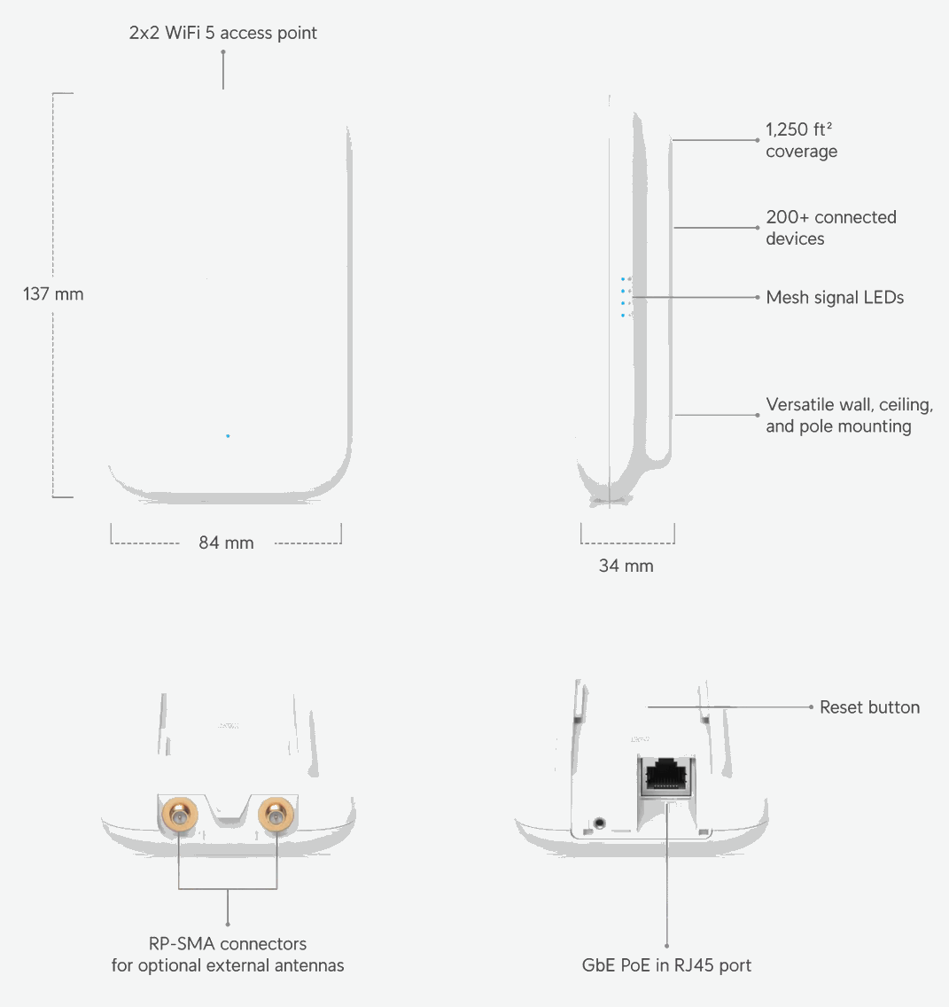 Incredibly compact, indoor/outdoor AP with versatile mounting options and long-range external antenna support.
