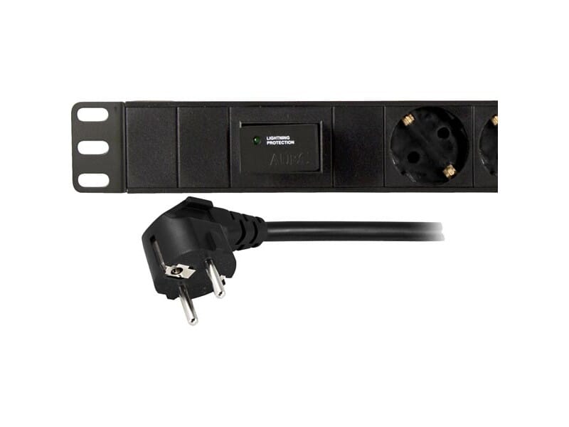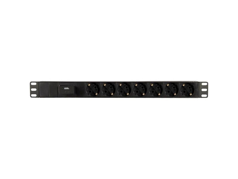 Kabelforgrener med 7xCEE 7/4 uttak, 1xCEE 7/7 tilkobling, uten bryter, overspenningsvern, 19" 1U, 2m kabel, svart.