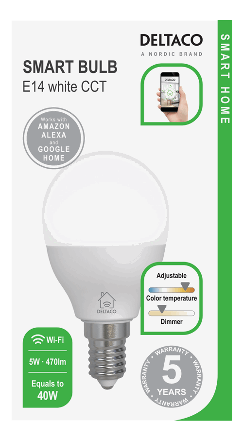 DELTACO SMART HOME LED lamp, E14, WiFI 2.4GHz, 5W, 470lm, dimmable, 2700K-6500K, 220-240V, white
