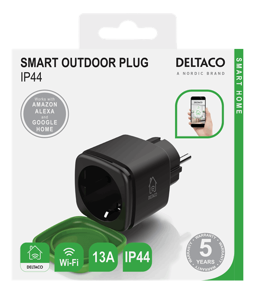 DELTACO SMART HOME Utendørskontakt, IP44, 802.11n 2.4GHz, timer, 1x CEE 7/3, svart/grønn