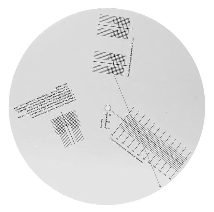 Stroboskopskive for å sjekke hastigheten på platespiller, og hjelpemiddel for kalibrering av pickup.