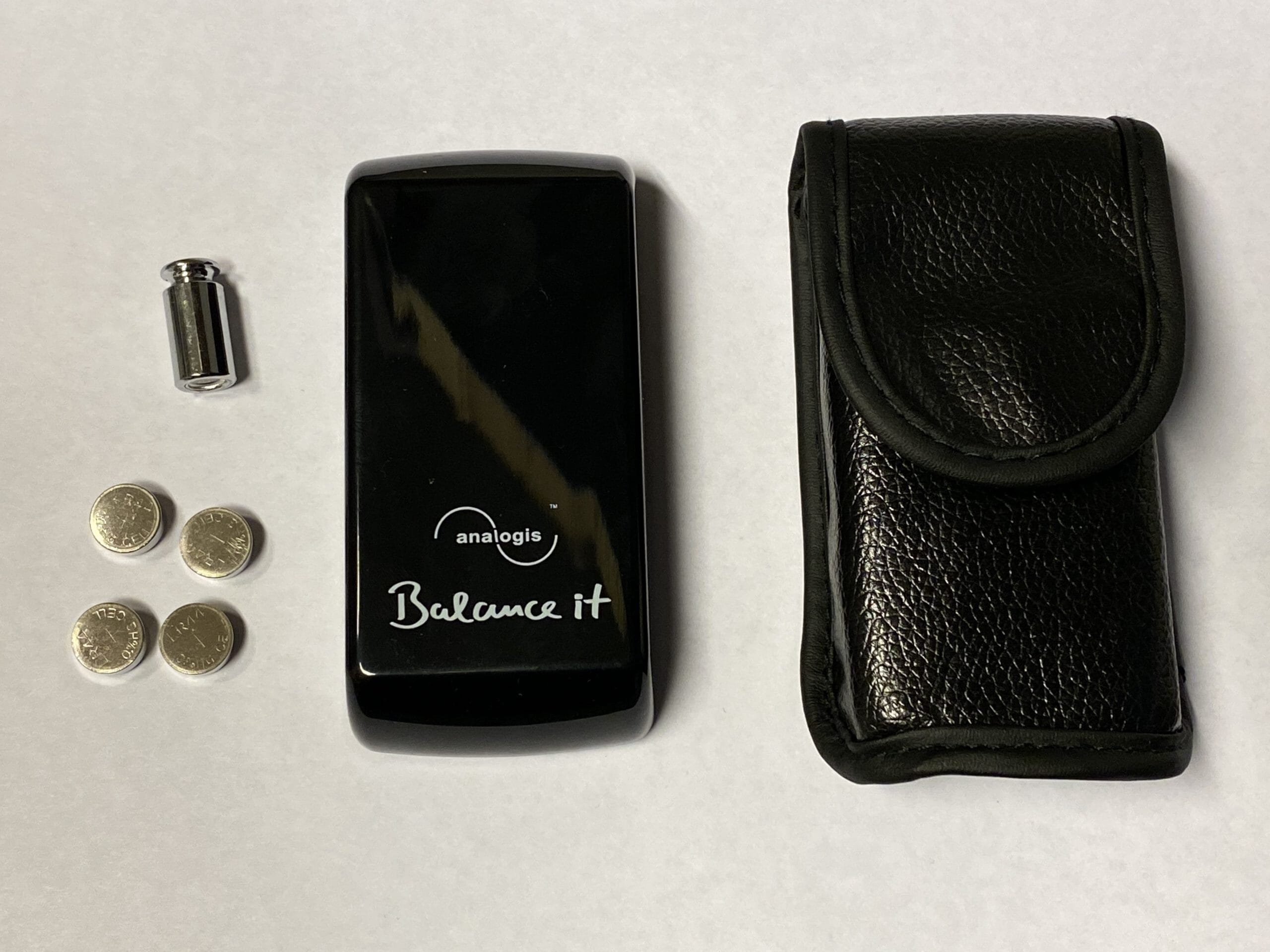 Pakken inneholder, i tillegg til skala og kalibrering, 2 knappecellebatterier og et lekkert etui.