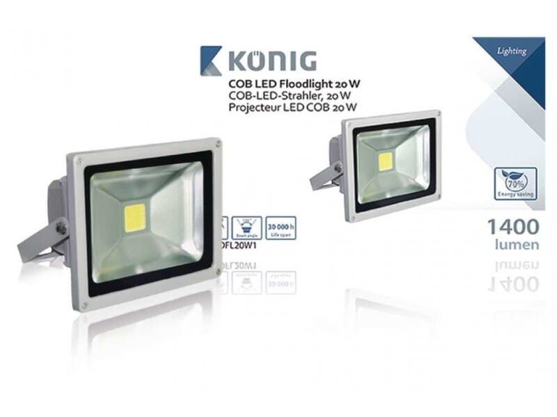 Innendørs og utendørs 20 watt LED-flomlys med svært effektiv lysytelse på 1400 lumen. Den kraftige LED-lampen med COB (innebygd brikke) bruker 70 % mindre energi enn tradisjonelle flomlys. I tillegg har LED-brikken en ekstremt lang levetid og kan vare i mer enn 30 000 timer.