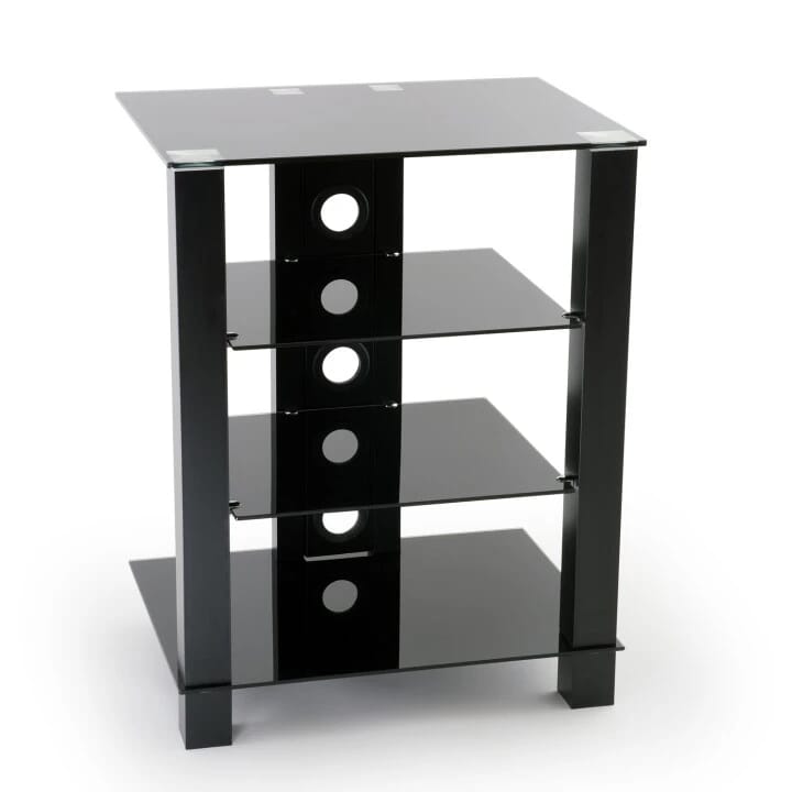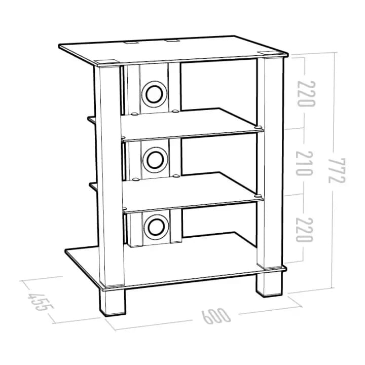 Hver hylle har en maksimal vektkapasitet på henholdsvis 30 kg for den øverste og nederste hyllen, og 20 kg for de to midterste. Racket måler 72,2 cm i høyde, 60 cm i bredde og 45,5 cm i dybde, med hylleavstander på 22 cm, 21 cm og 22 cm. Dette gir god plass til ulike lydkomponenter, samtidig som det sikrer stabilitet og holdbarhet.