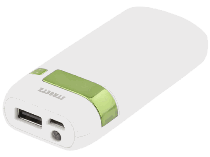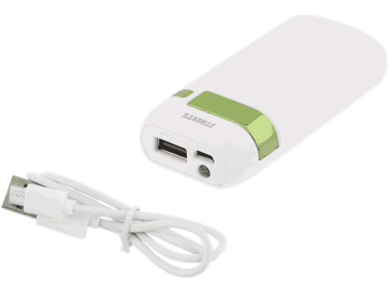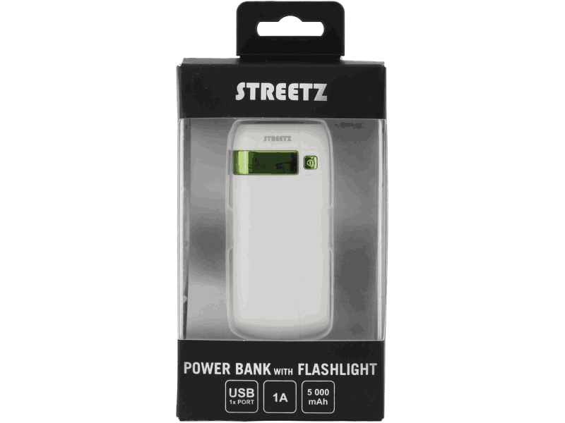 STREETZ Power Bank, 5000mAh, 5V 1A, 1xUSB Type A ho, lommelykt, hvit/grønn
