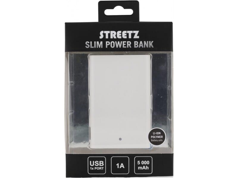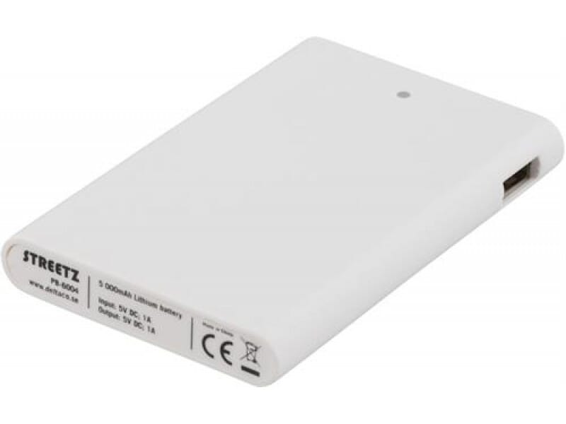 STREETZ Powerbank, portabelt batteri fr ladning av mobile enheter, lithium-ion polymer, 5000mAh, USB 5V 1A, hvit