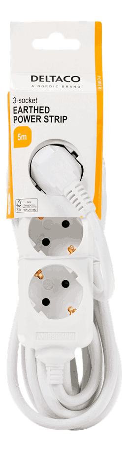 DELTACO Earthed power strip, 3x CEE 7/3, 1x CEE 7/7, child protected, 5m, white