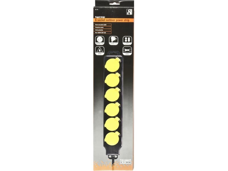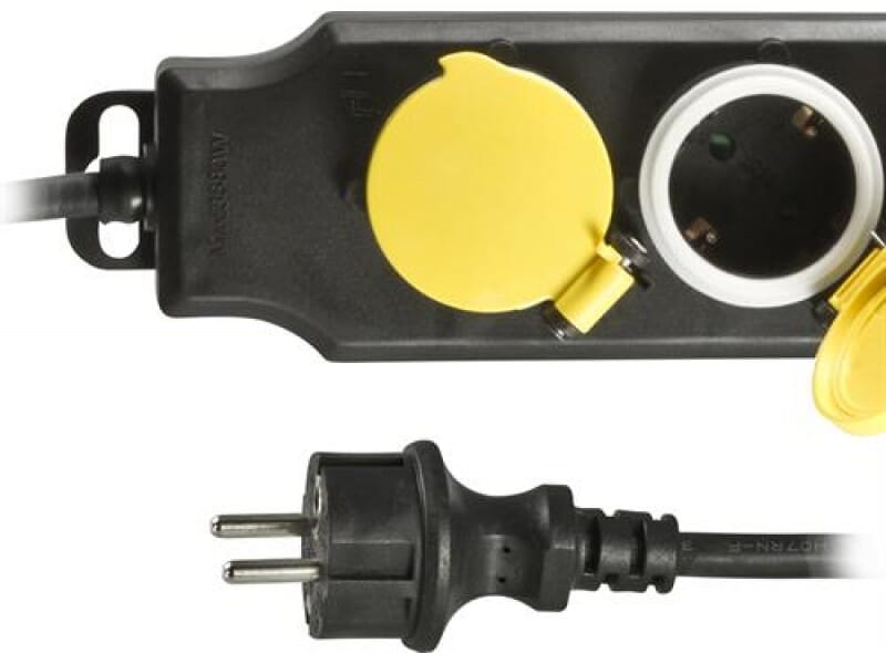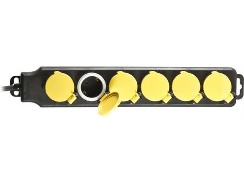 Kabelforgrener for utendørsbruk med 6xCEE 7/4 uttak, 1xCEE 7/7 tilkobling, IP44, 1,5m, gul/svart