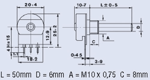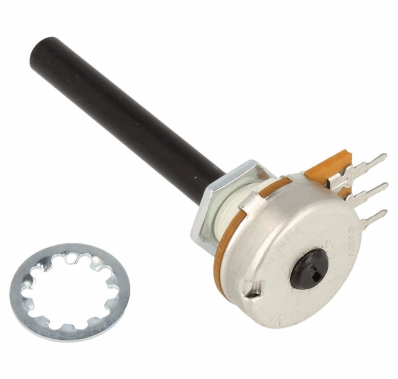 Motstand: 1 KO Effekt: 0,4W Type: Roterende potensiometer Lengde: 50 mm Diameter: 6 mm ROHS-konform: Ja Toleranse: 20%